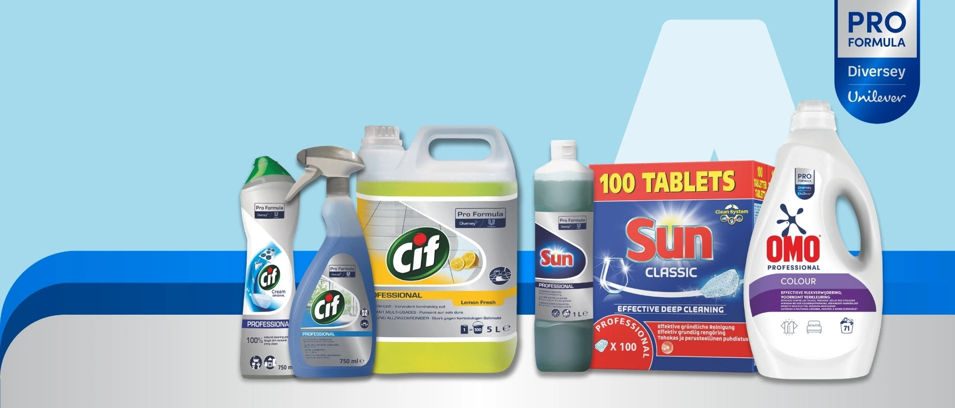 Obzvláště oblíbené jsou Prací prostředek Diversey OMO Professional Disinfectant Plus, který kombinuje hygienickou čistotu s dezinfekčním účinkem, a který Cif Professional Čistič koupelen 2 v 1, který spolehlivě odstraňuje vodní kámen a nečistoty, a také Odvápňovač Diversey TASKI Sani Calc, který účinně odstraňuje vodní kámen a šetří povrchy. Tyto tři produkty jsou příkladem toho, jak u společnosti Diversey jde ruku v ruce všestrannost, účinnost a udržitelnost.